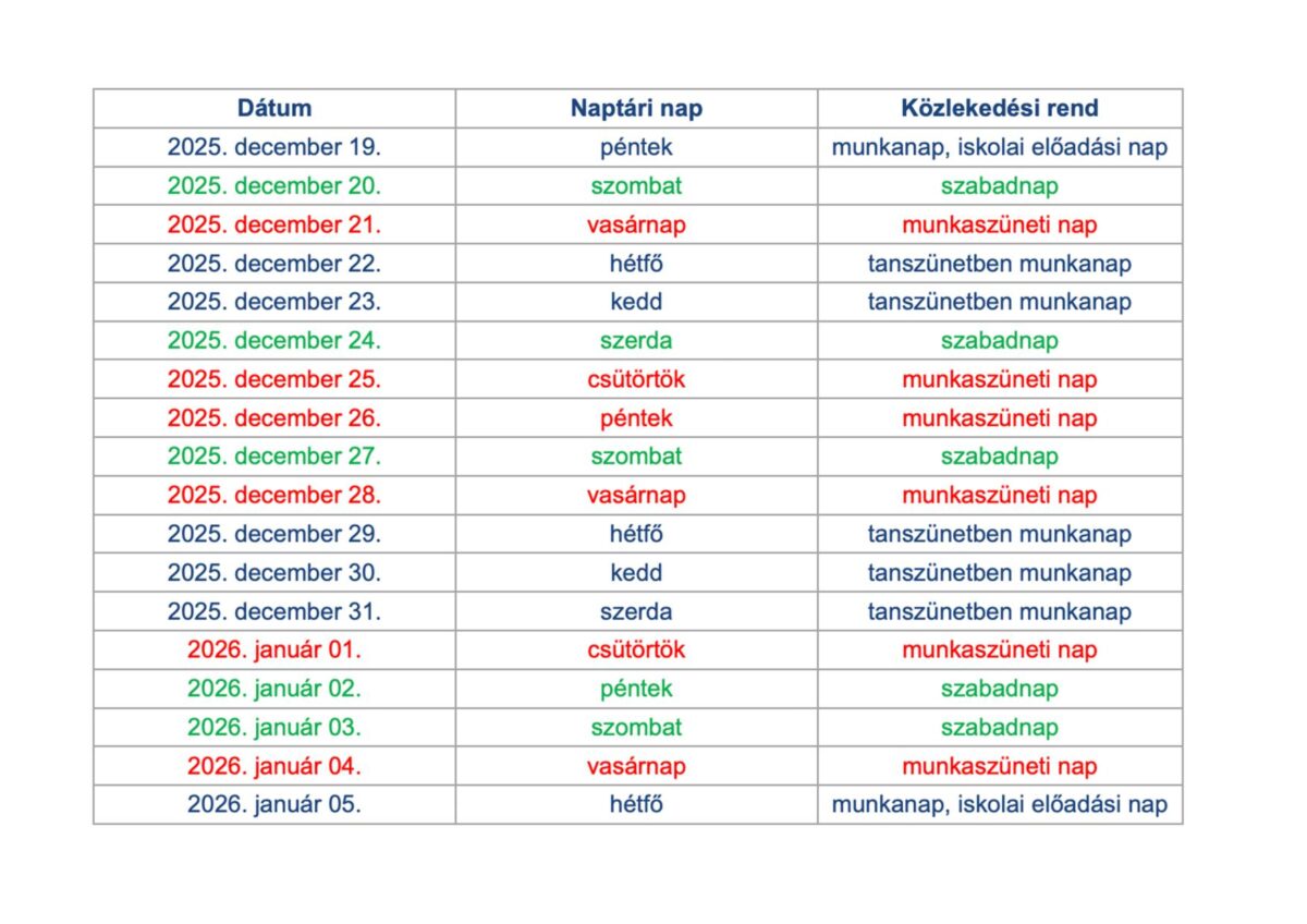 A MÁV Személyszállítási Zrt. tájékoztatja a tataiakat, hogy a karácsonyi, szilveszteri és újévi ünnepek, valamint az alap- és középfokú tanintézmények téli szünete körüli napokon Tata helyi közforgalmú menetrend szerinti autóbuszjáratait – az országos menetrendi naptárnak megfelelően – a csatolt táblázatban látható közlekedési rend szerint közlekedteti.