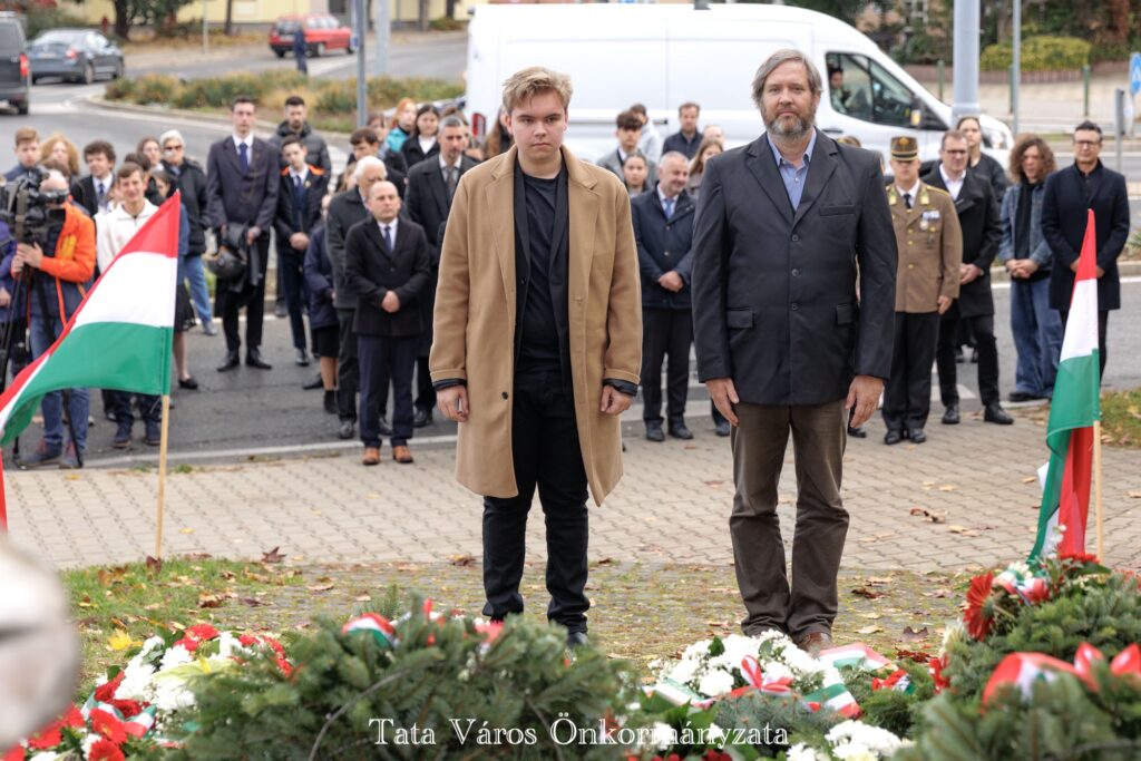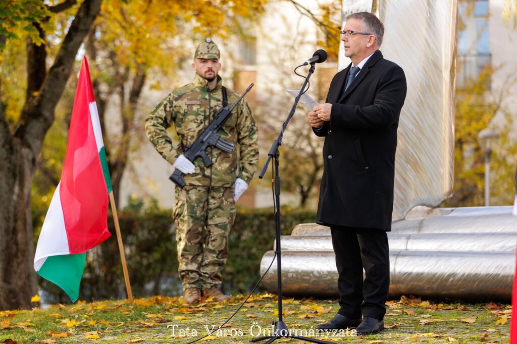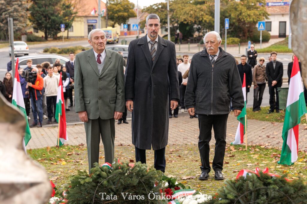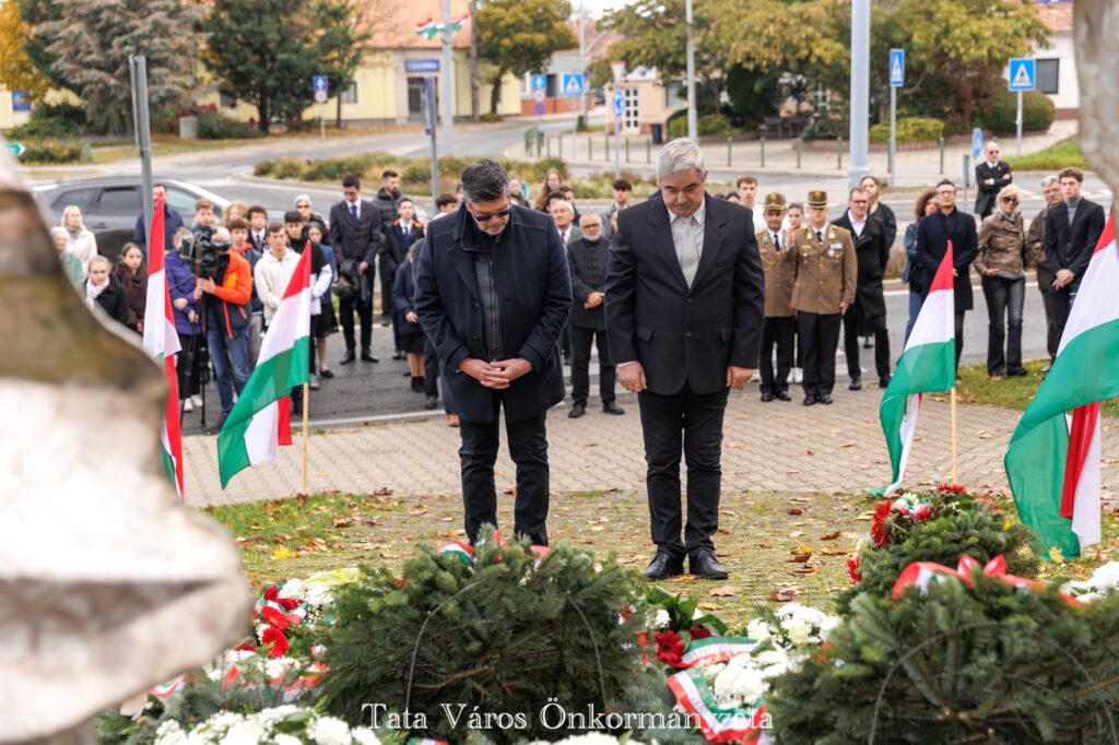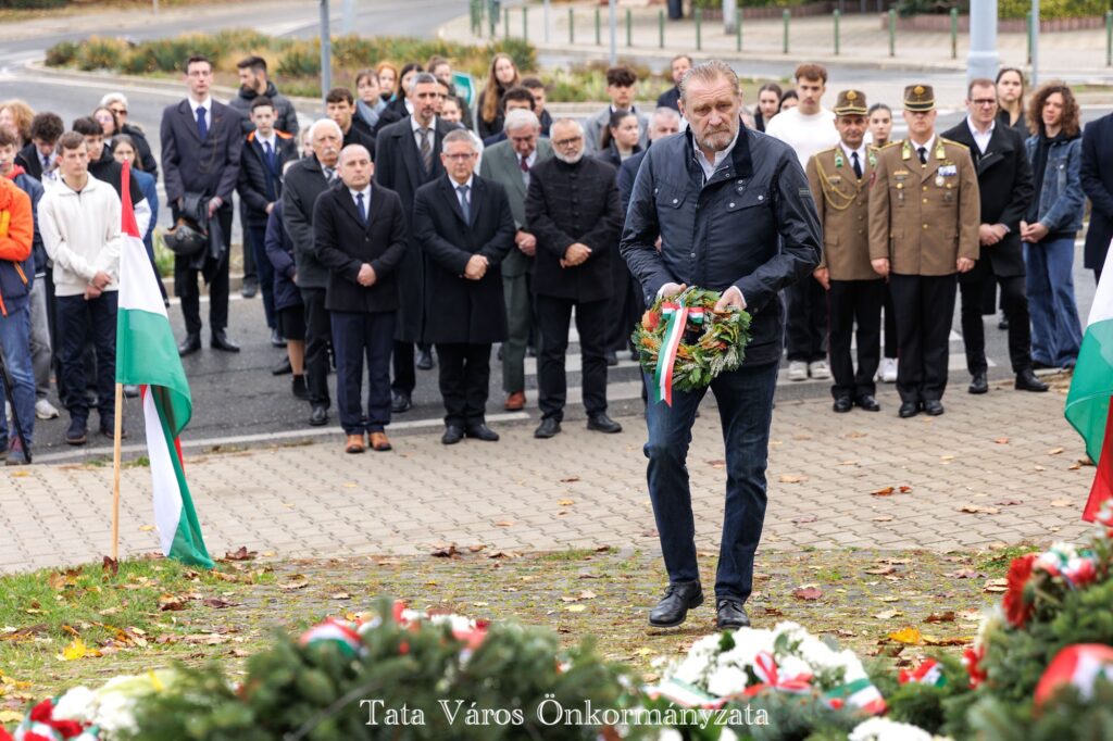 A forradalom és szabadságharc tatai eseményeire utalva városunk polgármestere elmondta: – Azért is vagyunk ma itt, hogy azokra a tatai családokra gondoljunk, akik ilyen XX. században tudtak úgy gondolkodni, hogy felnőhessenek ’56-os hőseink, akik egy, az általuk megéltnél szebb hazát akartak teremteni. Hálásan emlékezünk mindenkire, aki a bolsevik nyomorgatás és sunyi üldözés ellenére kitartott egy jobb haza újrateremtése mellett. Most újra nagy feladat előtt állunk. Béketeremtőkre vár a világ ezen része, olyanokra, akik képesek átlátni a szitán, és nem remeg meg a lábuk ma sem, ha egy bolsevik kerül a látóterükbe, akár zászlóval a vállán vagy pisztollyal az oldalán. Mert az irigység, az elégedetlenség és a gyűlöletkeltés helyett a teremtő munkát és a másik tiszteletét választják. Mert a másik lenézése, a felette való hatalmaskodás és ítélkezés helyett türelmesen, állhatatosan és alázatosan teszik a dolgukat. Mert minden öldöklő háború helyett az erőszakmentességet vagyis a békét, a béketeremtést választják a teremtettségükből fakadó józan ész alapján.