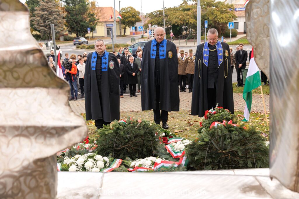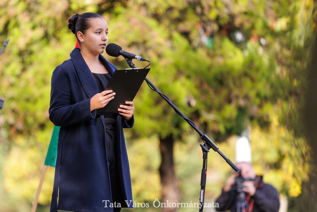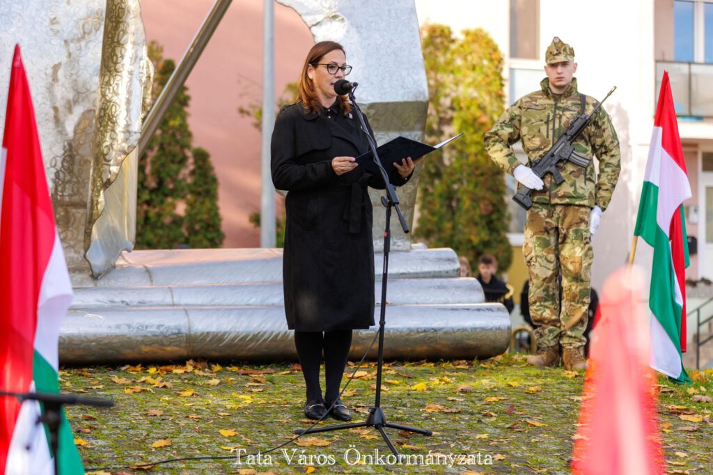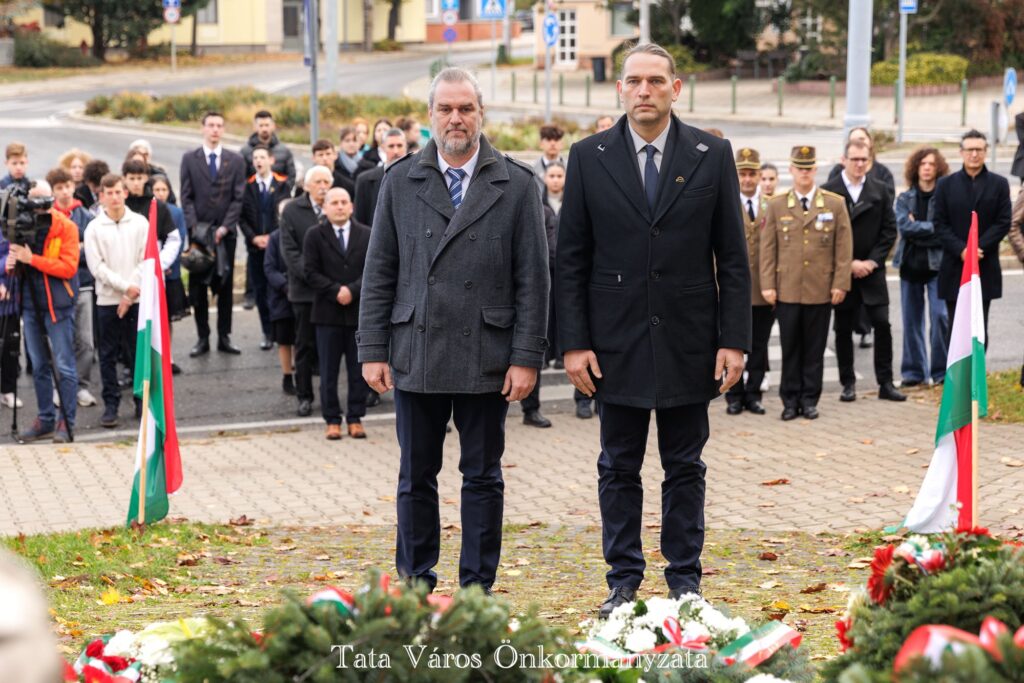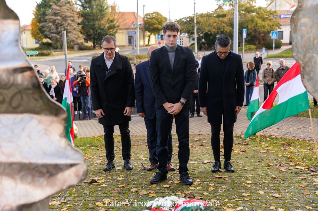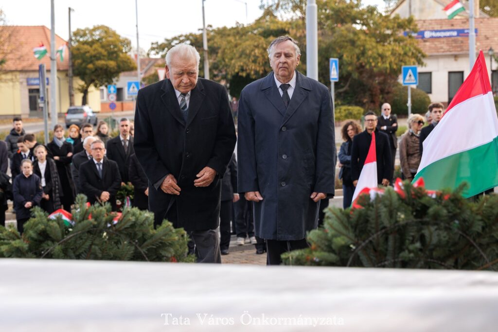 A forradalom és szabadságharc tatai eseményeire utalva városunk polgármestere elmondta: – Azért is vagyunk ma itt, hogy azokra a tatai családokra gondoljunk, akik ilyen XX. században tudtak úgy gondolkodni, hogy felnőhessenek ’56-os hőseink, akik egy, az általuk megéltnél szebb hazát akartak teremteni. Hálásan emlékezünk mindenkire, aki a bolsevik nyomorgatás és sunyi üldözés ellenére kitartott egy jobb haza újrateremtése mellett. Most újra nagy feladat előtt állunk. Béketeremtőkre vár a világ ezen része, olyanokra, akik képesek átlátni a szitán, és nem remeg meg a lábuk ma sem, ha egy bolsevik kerül a látóterükbe, akár zászlóval a vállán vagy pisztollyal az oldalán. Mert az irigység, az elégedetlenség és a gyűlöletkeltés helyett a teremtő munkát és a másik tiszteletét választják. Mert a másik lenézése, a felette való hatalmaskodás és ítélkezés helyett türelmesen, állhatatosan és alázatosan teszik a dolgukat. Mert minden öldöklő háború helyett az erőszakmentességet vagyis a békét, a béketeremtést választják a teremtettségükből fakadó józan ész alapján.