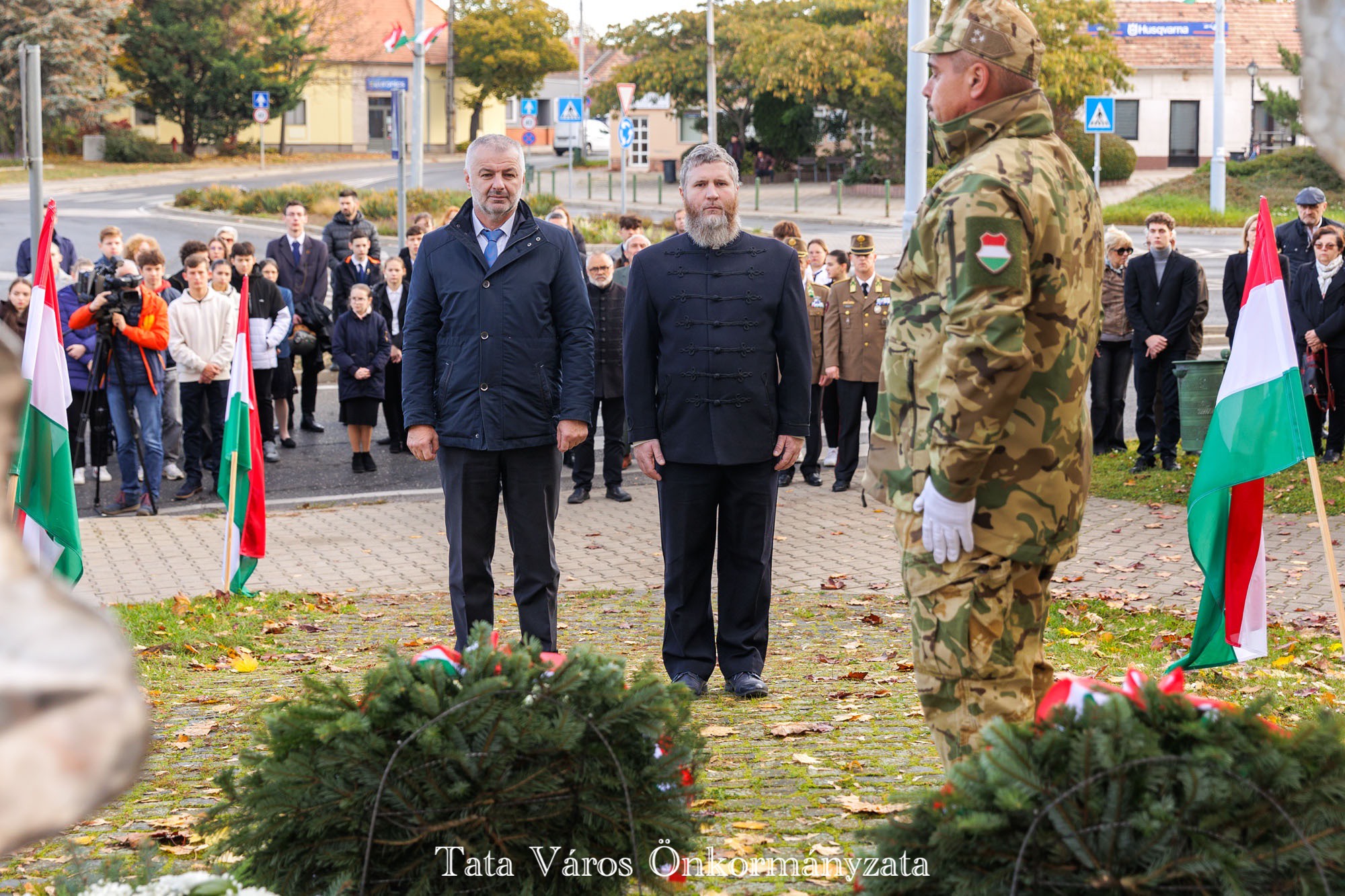 A forradalom és szabadságharc tatai eseményeire utalva városunk polgármestere elmondta: – Azért is vagyunk ma itt, hogy azokra a tatai családokra gondoljunk, akik ilyen XX. században tudtak úgy gondolkodni, hogy felnőhessenek ’56-os hőseink, akik egy, az általuk megéltnél szebb hazát akartak teremteni. Hálásan emlékezünk mindenkire, aki a bolsevik nyomorgatás és sunyi üldözés ellenére kitartott egy jobb haza újrateremtése mellett. Most újra nagy feladat előtt állunk. Béketeremtőkre vár a világ ezen része, olyanokra, akik képesek átlátni a szitán, és nem remeg meg a lábuk ma sem, ha egy bolsevik kerül a látóterükbe, akár zászlóval a vállán vagy pisztollyal az oldalán. Mert az irigység, az elégedetlenség és a gyűlöletkeltés helyett a teremtő munkát és a másik tiszteletét választják. Mert a másik lenézése, a felette való hatalmaskodás és ítélkezés helyett türelmesen, állhatatosan és alázatosan teszik a dolgukat. Mert minden öldöklő háború helyett az erőszakmentességet vagyis a békét, a béketeremtést választják a teremtettségükből fakadó józan ész alapján.