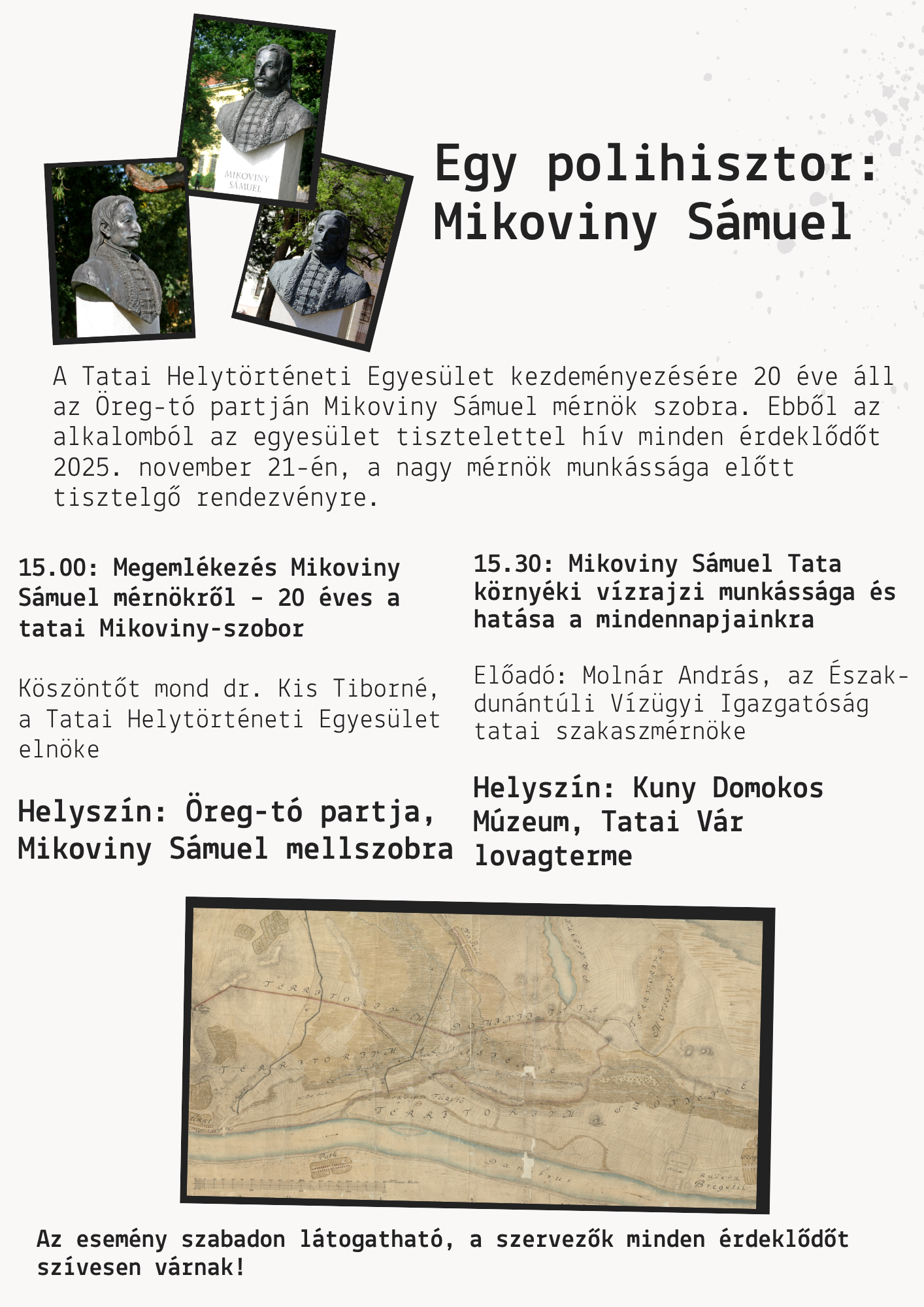 A Tatai Helytörténeti Egyesület kezdeményezésére 20 éve áll az Öreg-tó partján Mikoviny Sámuel szobra. Ebből az alkalomból szervez az egyesület megemlékezést 2025. november 21-én, a nagy mérnök munkássága előtt tisztelegve.