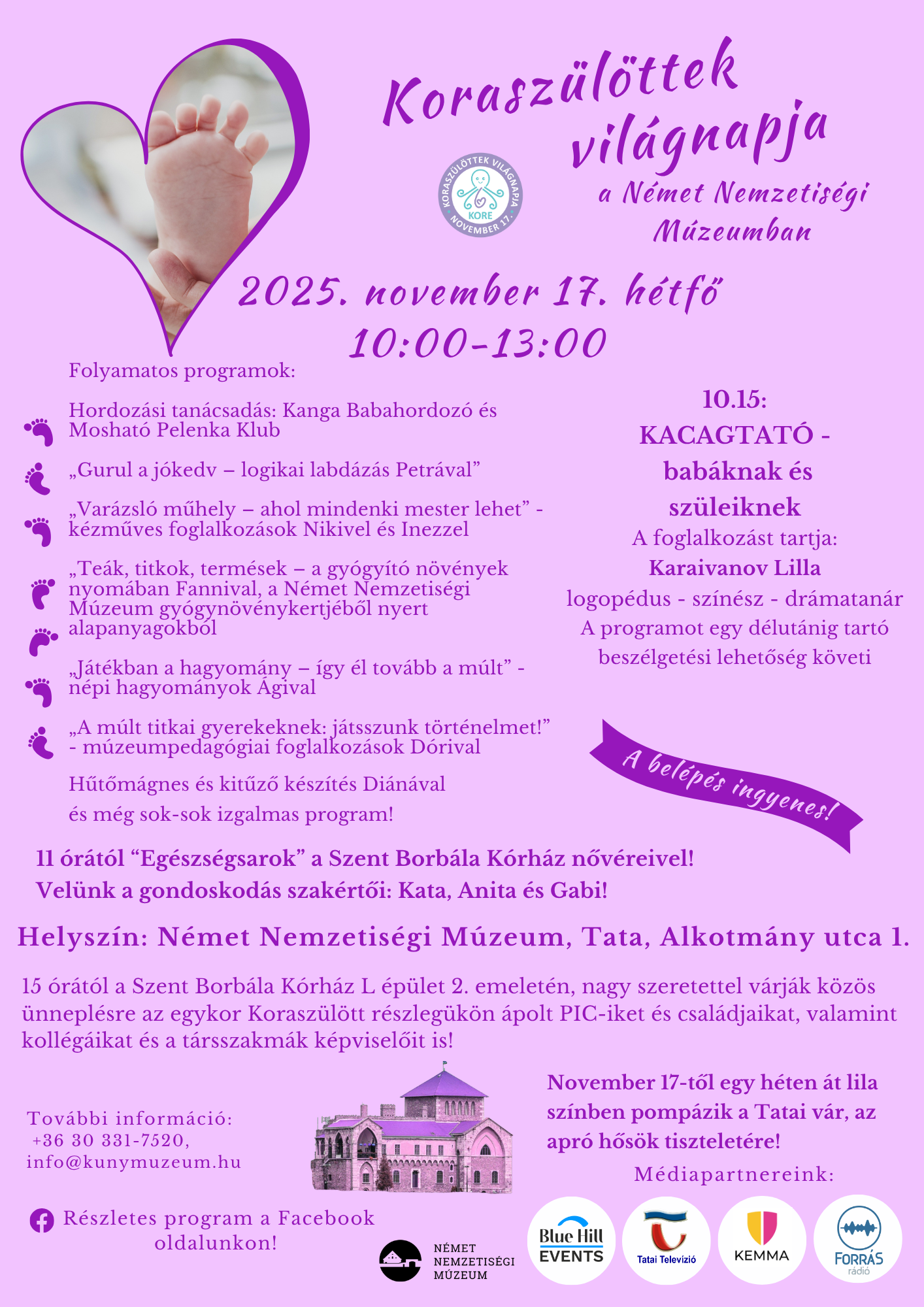 November 17-én hétfőn 10:00 és 13:00 óra között nővérek, fejlesztő pedagógusok és múzeumpedagógusok közreműködésével ünneplik a koraszülöttek világnapját a Német Nemzetiségi Múzeumban. Az ingyenes rendezvényre szeretettel várják az érdeklődőket.