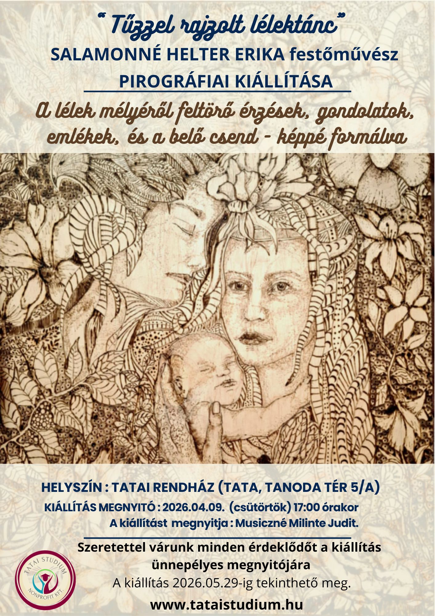 A Piarista Rendházban április 9-én 17:00 órakor nyitják meg Salamonné Helter Erika festőművész pirográfiai kiállítását „Tűzzel rajzolt lélektánc” címmel.