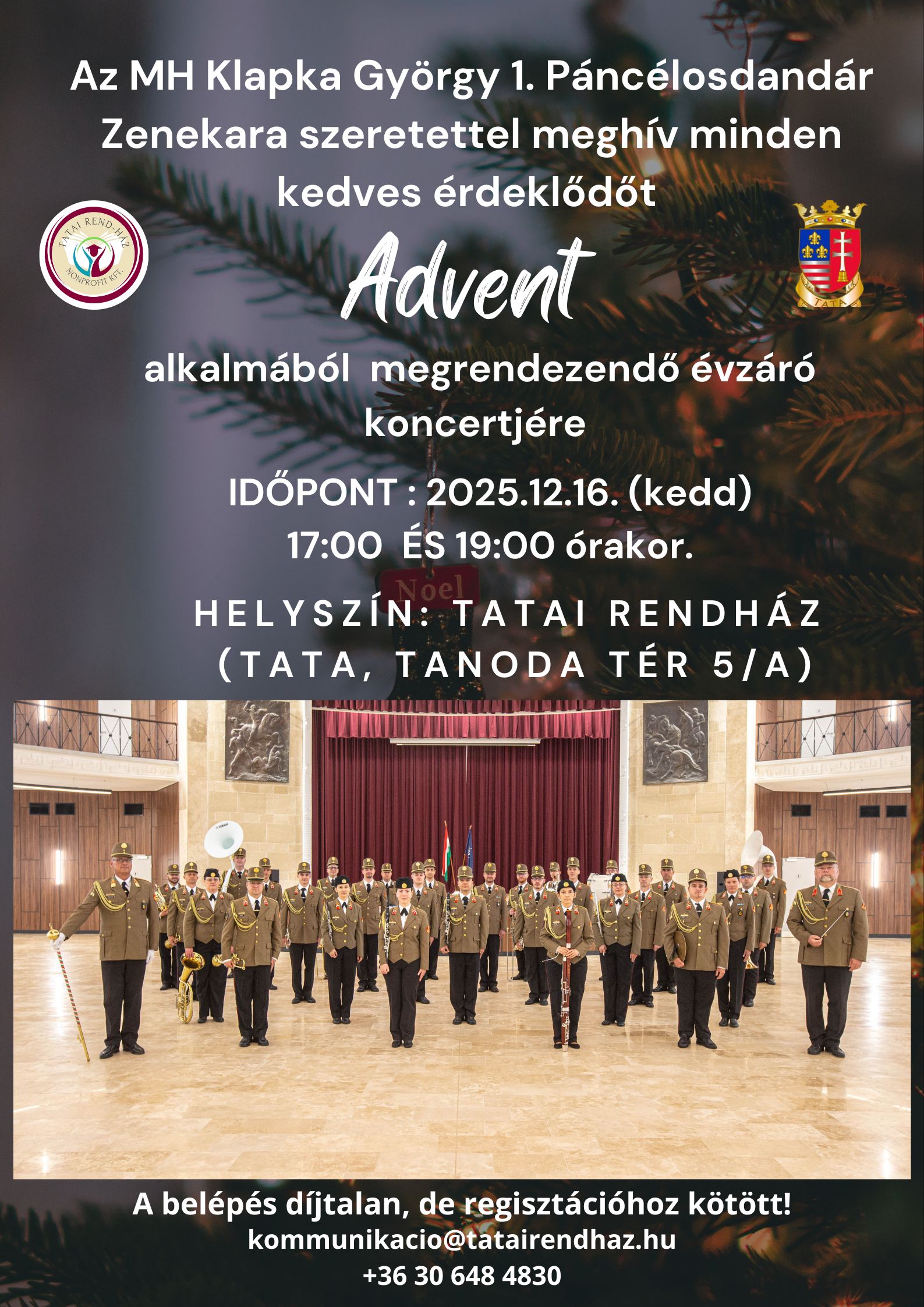 Adventi koncertre várja az érdeklődőket az MH. Klapka György 1. Páncélosdandár Zenekara december 16-án 17:00 és 19:00 órakor a Piarista Rendházba. A koncerten való részvétel ingyenes, de regisztrációhoz kötött. Regisztrálni e-mailben vagy telefonon lehetséges: kommunikacio@tatairendhaz.hu 06/30-648-4830