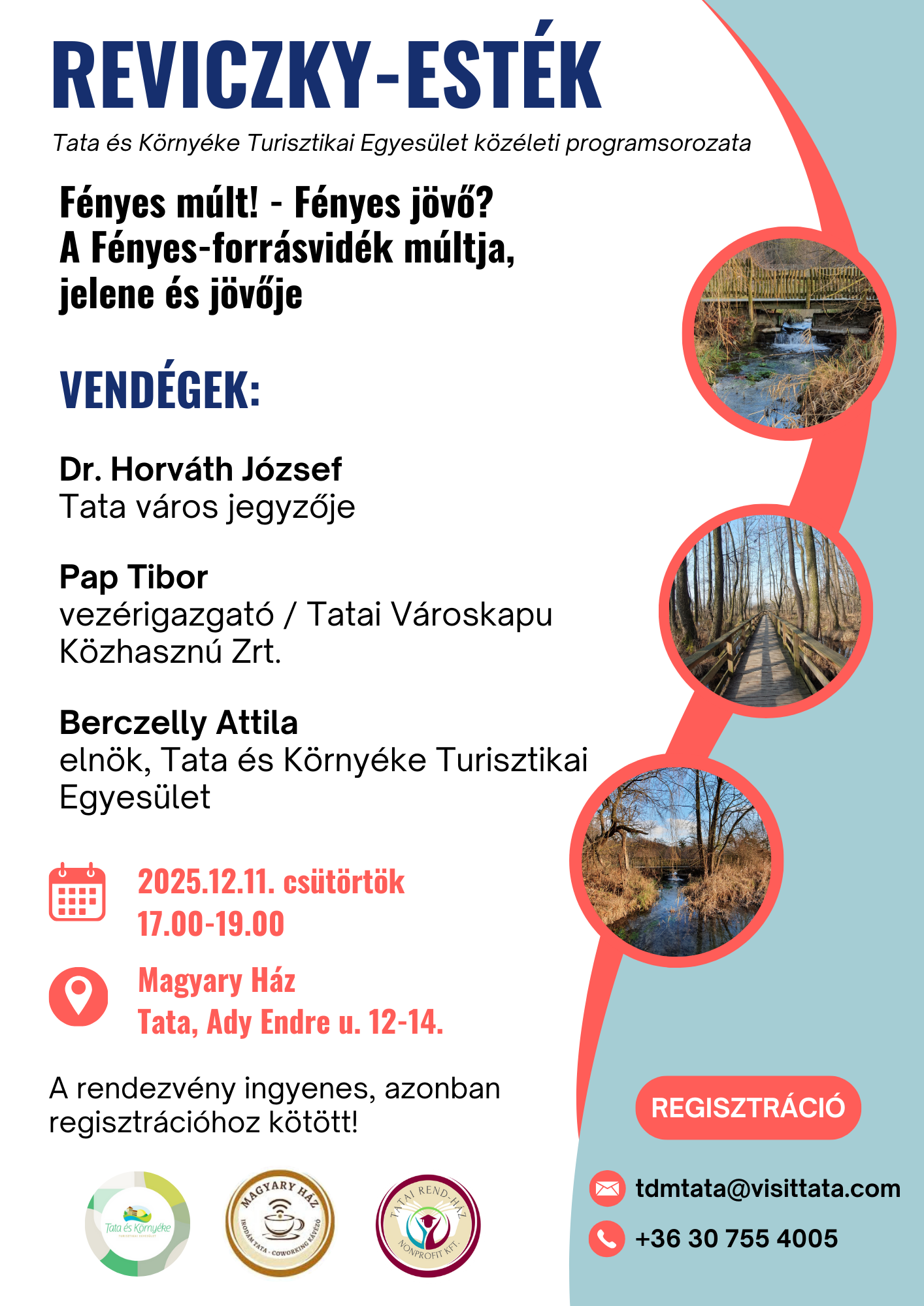 December 11-én folytatódik a Tata és Környéke Turisztikai Egyesület „Reviczky-esték” programsorozata. A Magyary Házban ezúttal a Fényes forrásvidék témáját járják körbe a meghívott vendégek 17:00 órától. A rendezvény ingyenesen látogatható, de regisztrációhoz kötött, mely megtehető a tdmtata@visittata.com e-mail címen.