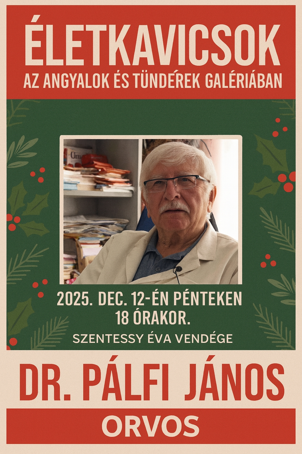 December 12-én pénteken, az Angyalok és Tündérek Galéria idei utolsó „Életkavicsok” estjének vendége dr. Pálfi János háziorvos lesz 18:00 órától.