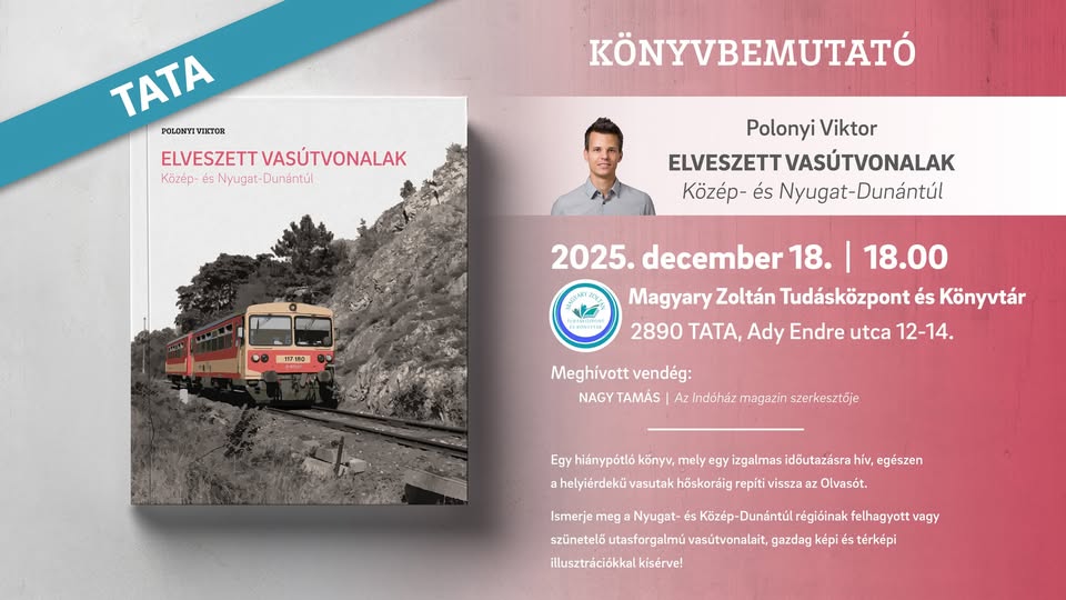A Magyary Zoltán Tudásközpont és Könyvtár ad helyet Polonyi Viktor: „Elveszett vasútvonalak – Közép-és Nyugat-Dunántúl” című könyve tatai bemutatójának, december 18-án 18:00 órától. Az eseményt Horváthy Lóránt nyitja meg, a meghívott vendég Nagy Tamás lesz.