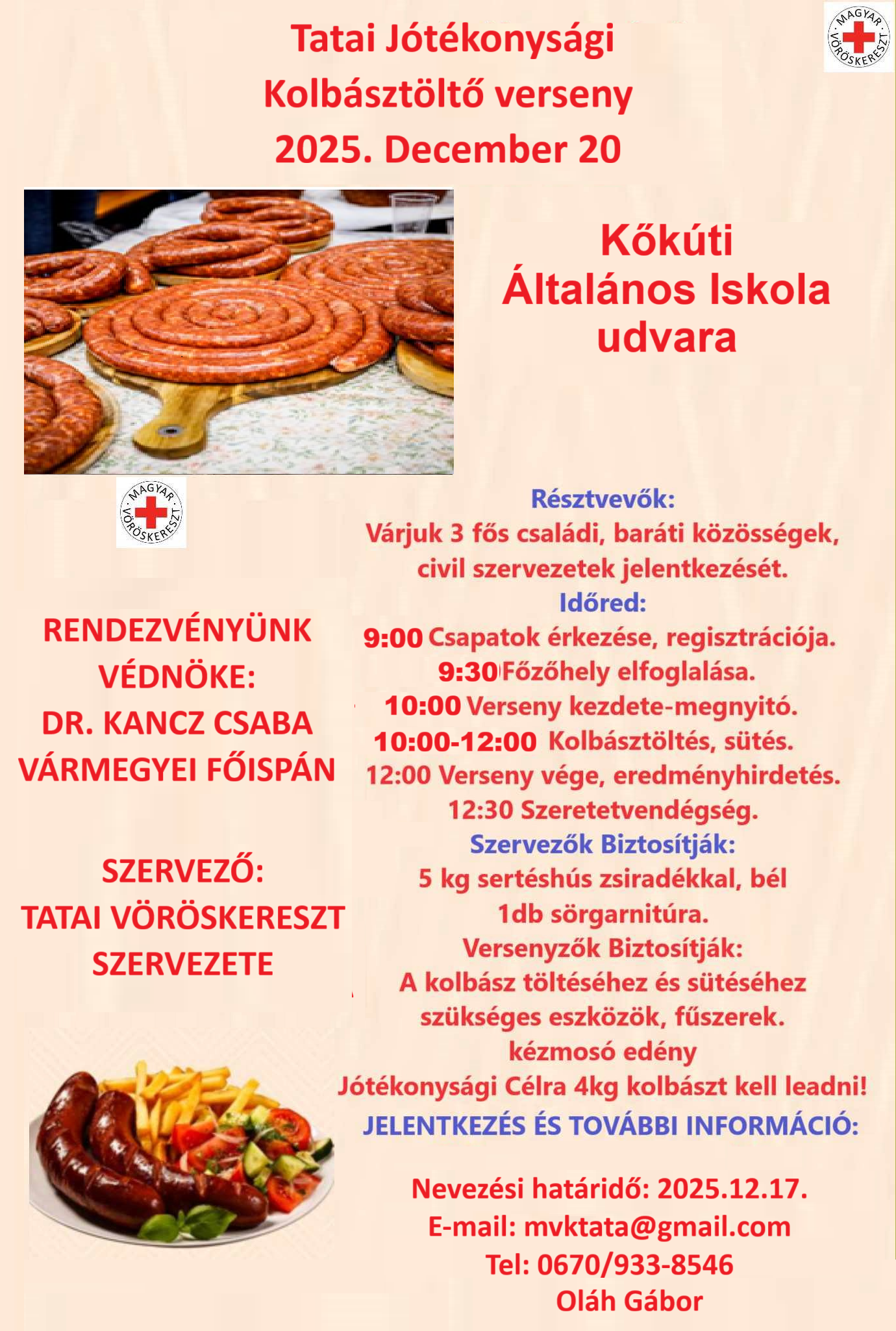 Jótékonysági kolbásztöltő versenyt rendez a Vöröskereszt tatai szervezete december 20-án, a Kőkúti Általános Iskola udvarán. A szervezők várják 3 fős csapatok jelentkezését az mvktata@gmail.com e-mail címen, december 17-ig.