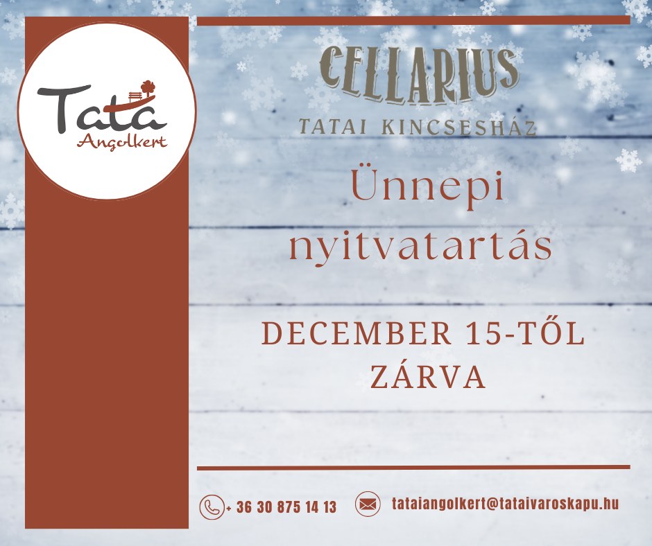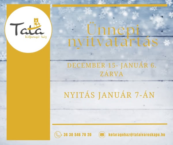 A Tatai Városkapu Nonprofit Zrt. tájékoztatása szerint a Tatai Fényes Tanösvény, a Kőfaragó-ház és a Fellner Jakab kilátó, valamint a Kiskastély és a Cellarius nyitvatartási rendje az év végi időszakban a következőképpen alakul: