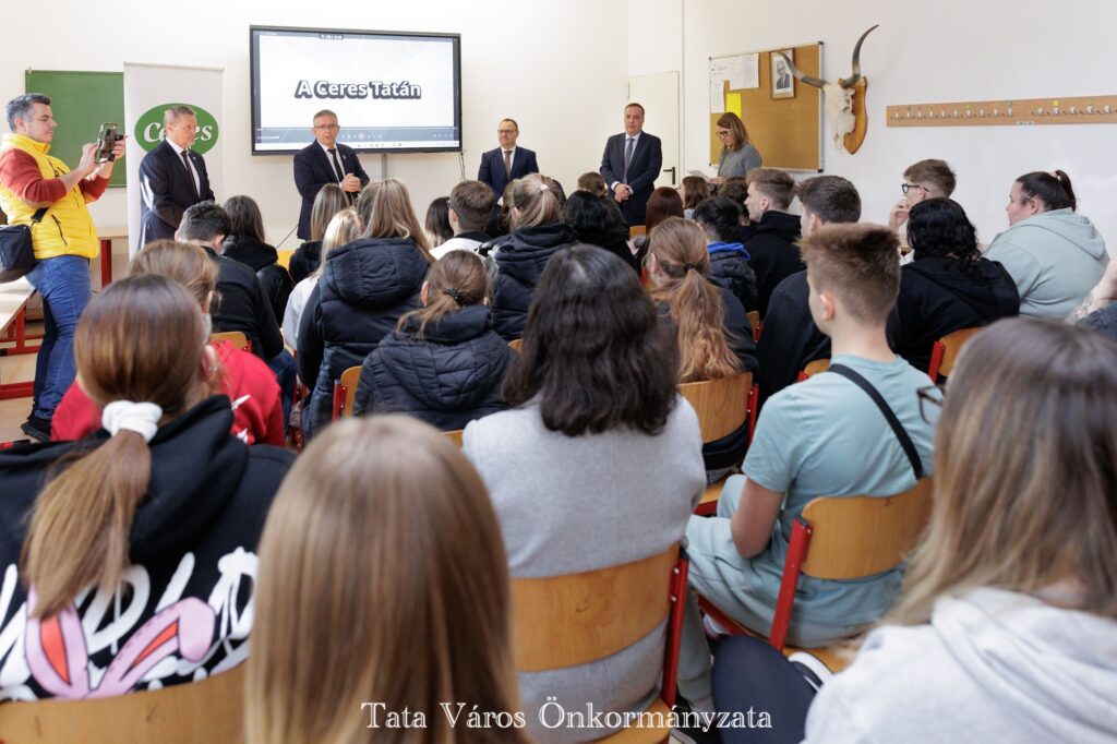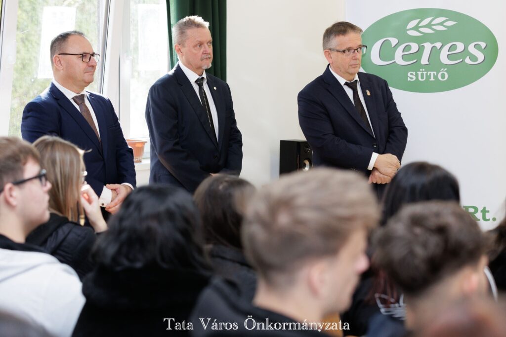 A 14 ezer négyzetméteres tatai üzemről Mikos István, a Ceres Zrt. vállalati igazgatója mesélt a diákoknak kiemelve, hogy az új fejlesztésnek köszönhetően Kelet-Közép-Európa legnagyobb kapacitású sütőüzeme fog megépülni, amelyben naponta 100 tonna kenyér fog elkészülni. A Ceres jelenleg Győrben és Miskolcon van jelen, elsősorban napi termékeket, cipókat, toast kenyereket, kalácsokat gyártanak, emellett fontosnak tartják az egészségtudatos táplálkozásba illeszthető termékek készítését is. A tatai beruházást 2024-ben hagyták jóvá, 2025 a projektindítás éve, az első berendezések pedig a tervek szerint 2027-ben érkeznek majd. A gyárban a legmodernebb technológia kap helyet, de nemcsak a gyártási folyamatok, hanem a raktározás, a kartonba helyezés, a logisztikára történő átszállítás is robot és AI (mesterséges intelligencia) technológiával fog megvalósulni.