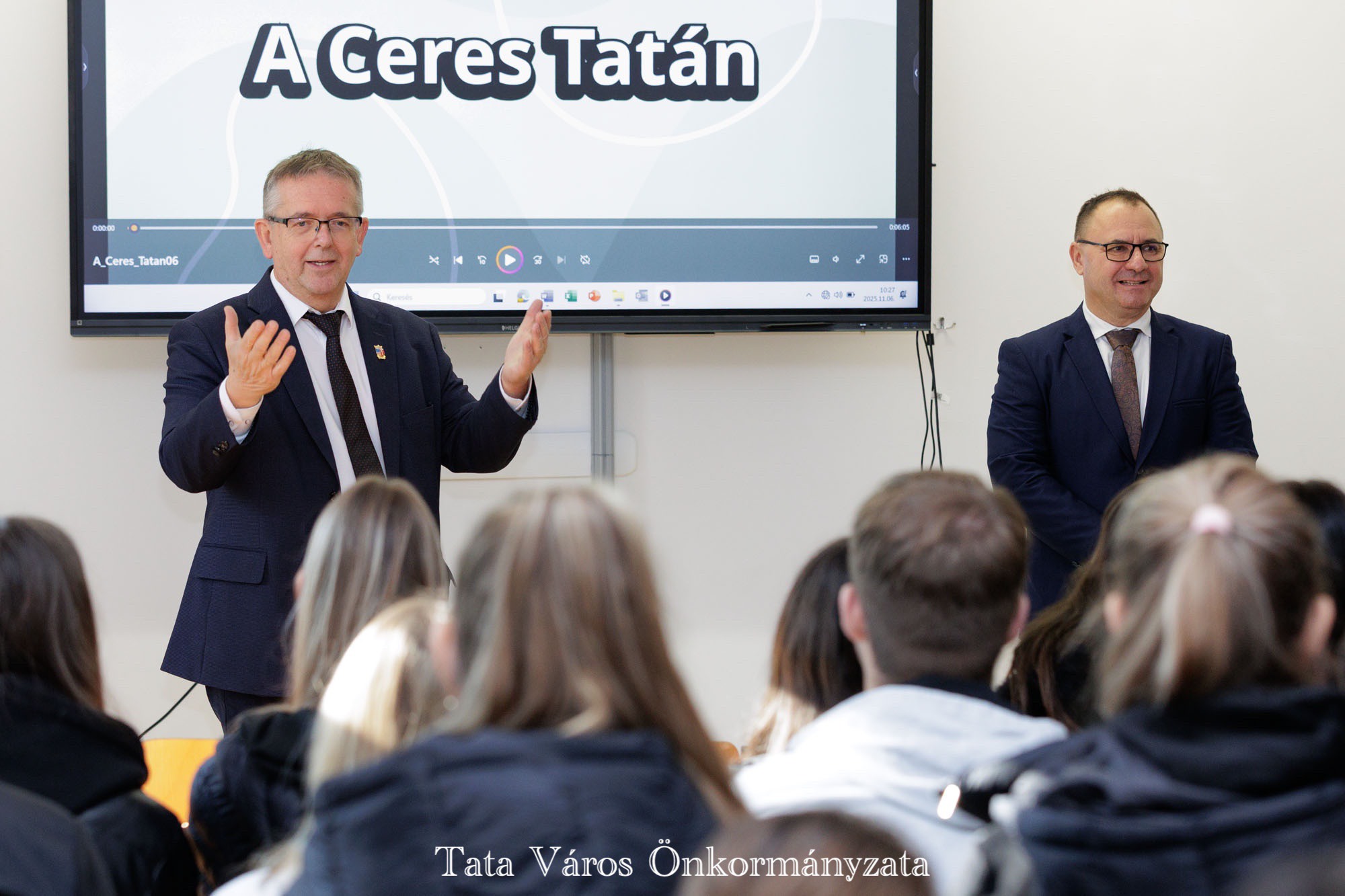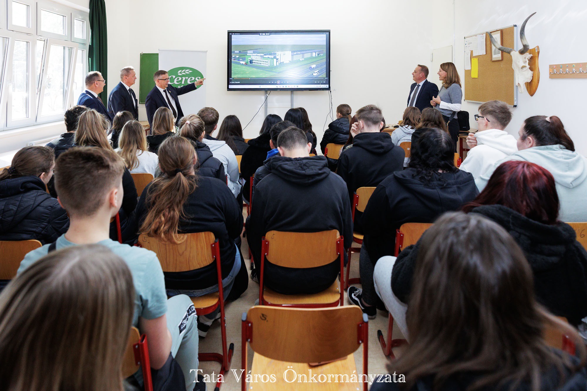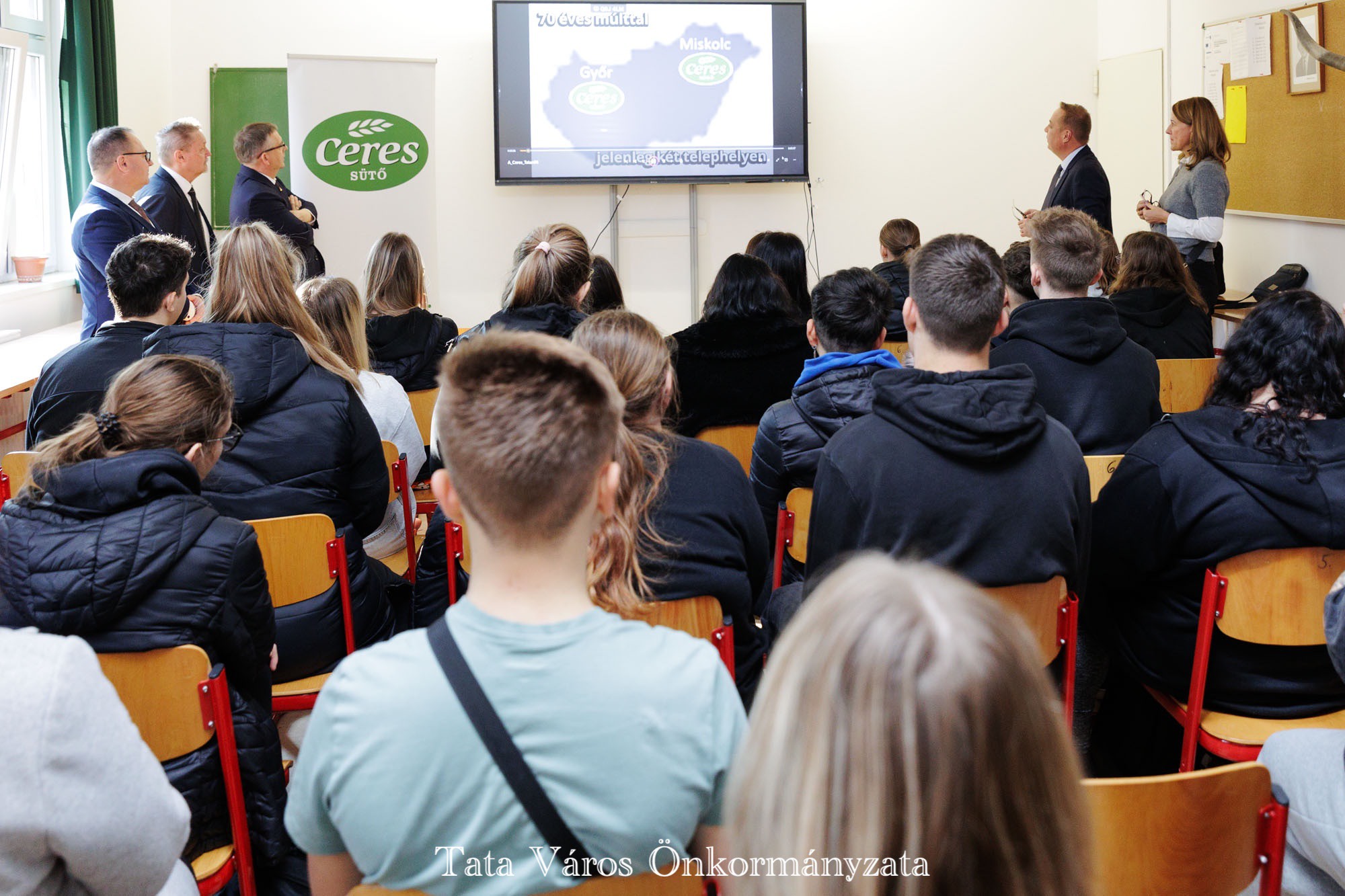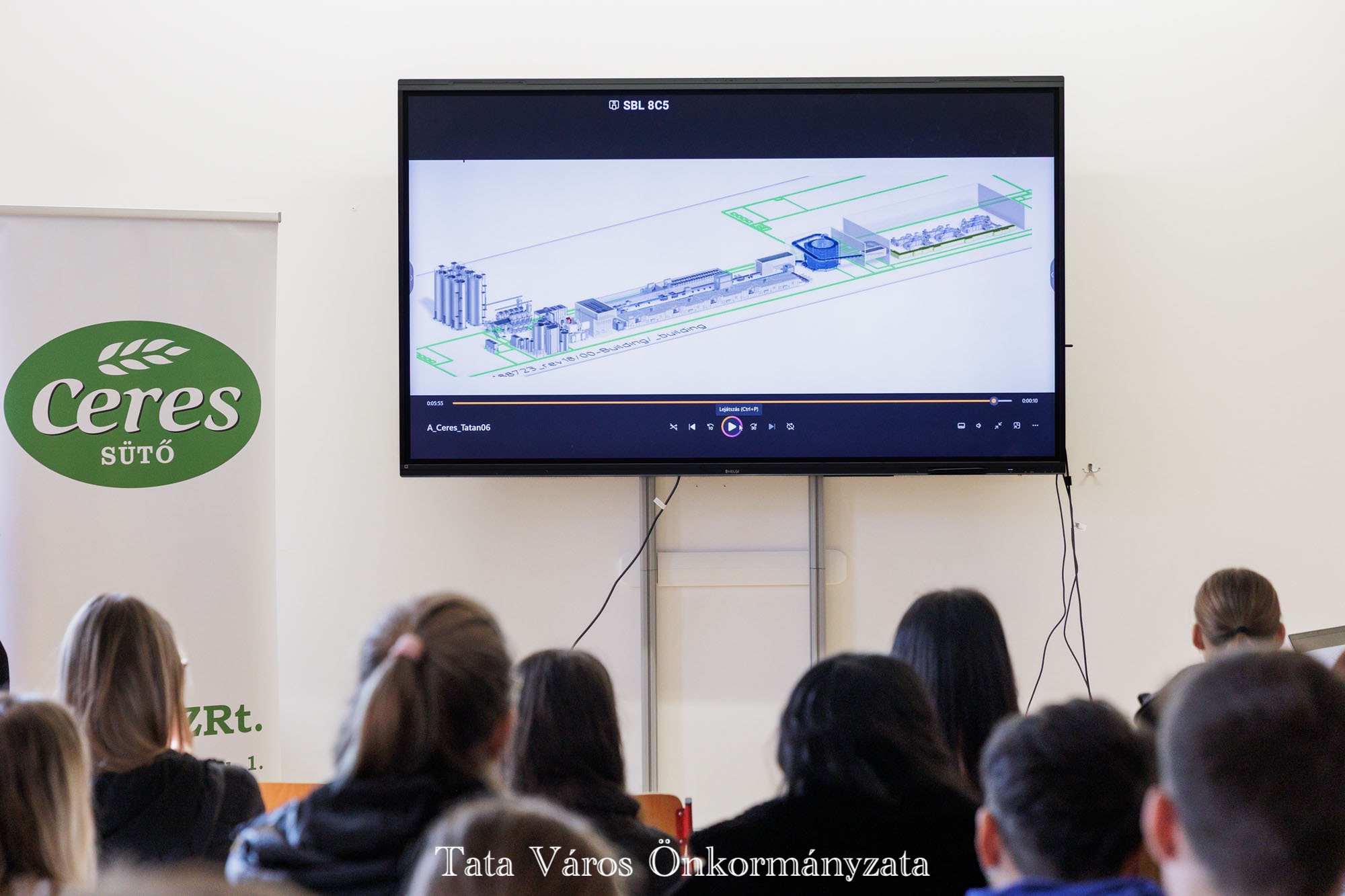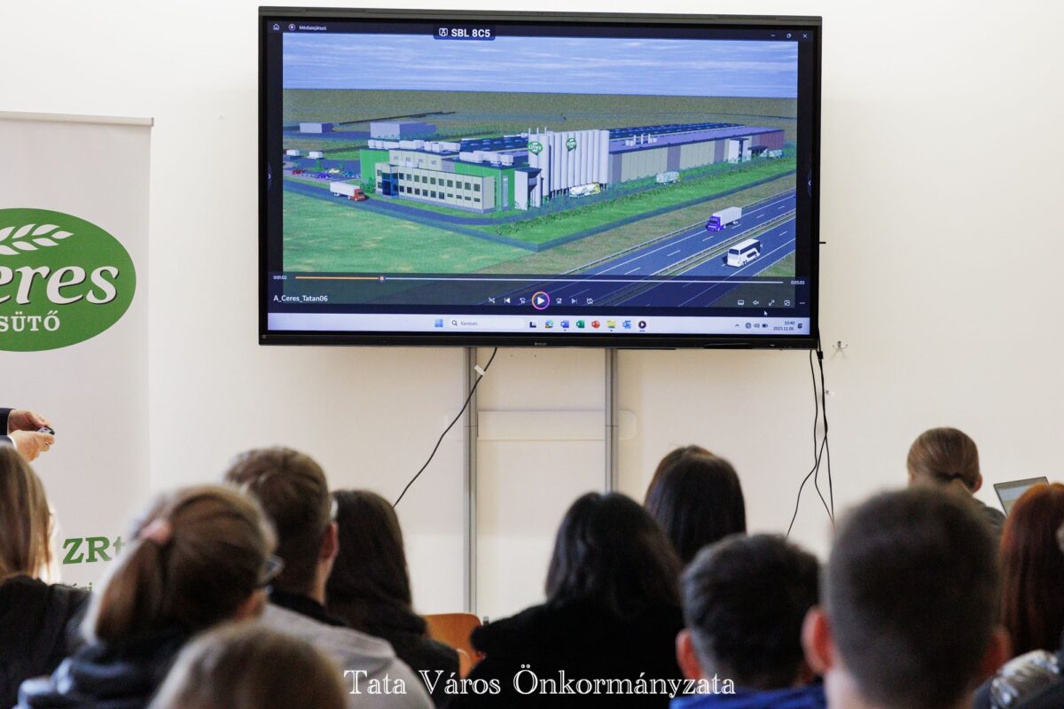 A 14 ezer négyzetméteres tatai üzemről Mikos István, a Ceres Zrt. vállalati igazgatója mesélt a diákoknak kiemelve, hogy az új fejlesztésnek köszönhetően Kelet-Közép-Európa legnagyobb kapacitású sütőüzeme fog megépülni, amelyben naponta 100 tonna kenyér fog elkészülni. A Ceres jelenleg Győrben és Miskolcon van jelen, elsősorban napi termékeket, cipókat, toast kenyereket, kalácsokat gyártanak, emellett fontosnak tartják az egészségtudatos táplálkozásba illeszthető termékek készítését is. A tatai beruházást 2024-ben hagyták jóvá, 2025 a projektindítás éve, az első berendezések pedig a tervek szerint 2027-ben érkeznek majd. A gyárban a legmodernebb technológia kap helyet, de nemcsak a gyártási folyamatok, hanem a raktározás, a kartonba helyezés, a logisztikára történő átszállítás is robot és AI (mesterséges intelligencia) technológiával fog megvalósulni.