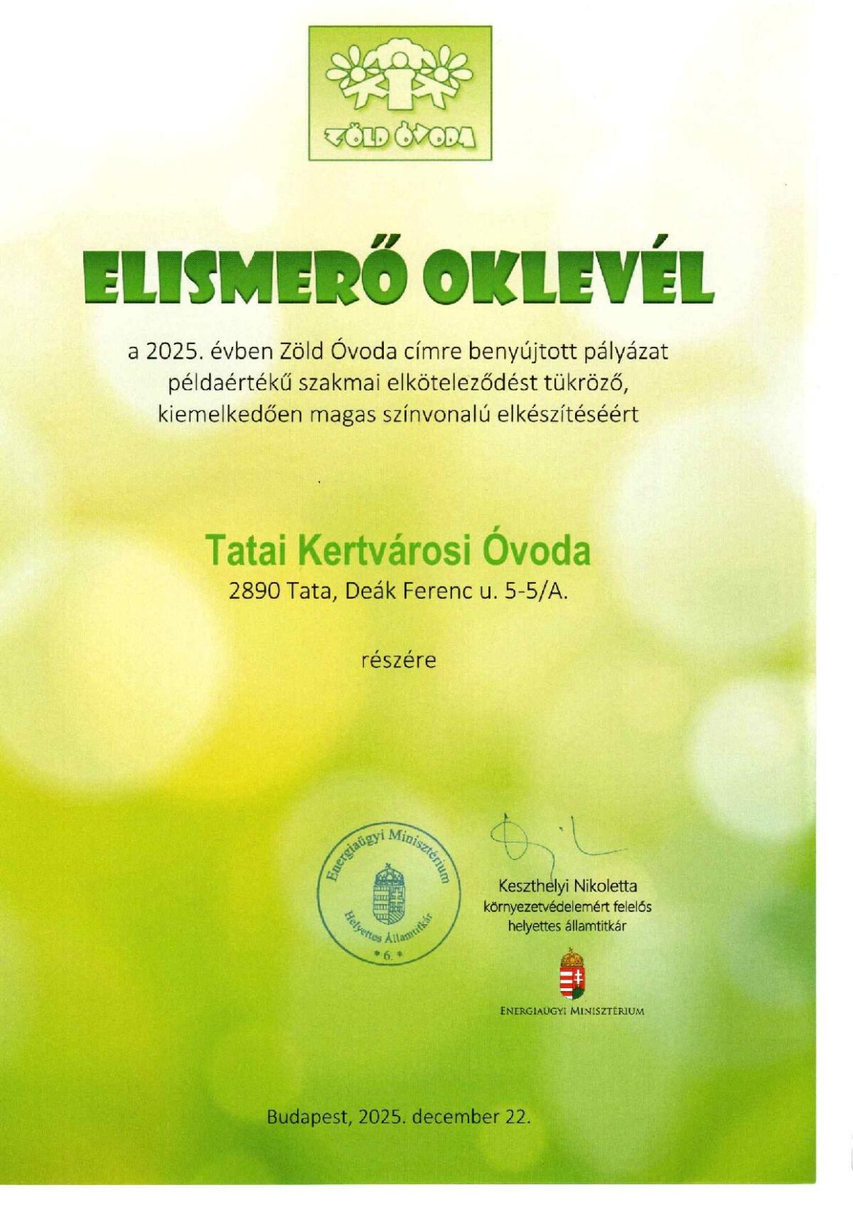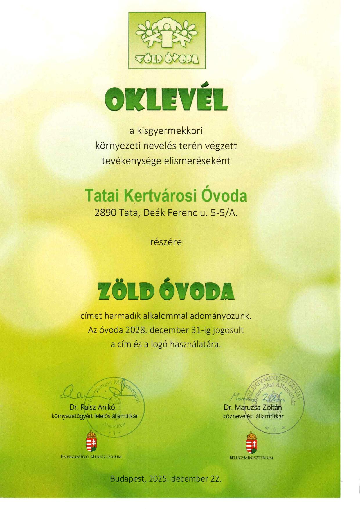 A Tatai Kertvárosi Óvoda a 2025-ös Zöld Óvoda cím pályázaton a közel 300 jelentkező közül a legeredményesebb öt intézmény között végzett, a kiemelkedő eredményt külön elismerő oklevéllel díjazta a Energiaügyi Minisztérium, amely indoklásában a példaértékű szakmai elkötelezettséget és a kiemelkedően magas színvonalú pedagógiai munkát emelte ki. Az óvodában a környezettudatos nevelés nem csupán egy program, hanem a mindennapok része. A gyermekek már egészen kicsi korban játékos formában ismerkednek meg a természet védelmével: megtanulják a szelektív hulladékgyűjtés alapjait, kertészkednek, kirándulnak, megfigyelik az évszakok változását, és rendszeresen vesznek részt természetközeli tevékenységekben. A pedagógusok számára fontos, hogy a gyerekek élmények útján tapasztalják meg a természetet és annak működését. Ennek egyik legkülönlegesebb programja az erdei óvoda, amelyet minden évben megszerveznek, ilyenkor a kicsik két napot töltenek a természetben, kirándulnak, felfedezik az erdő élővilágát, játékos foglalkozásokon vesznek részt, és ott is alszanak a pedagógusokkal. Ez a közös program maradandó élményt jelent a gyerekek számára, miközben erősíti a természet iránti szeretetet és tiszteletet. Az intézmény vezetője, Petőné Sáradi Zsuzsanna elmondta, hogy a környezeti nevelés iránti elkötelezettségüket az elmúlt években már több rangos szakmai elismerés is igazolta. 2018-ban elnyerték a Madárbarát Óvoda cím minősítést, majd 2019-ben és 2022-ben is megszerezték a Zöld Óvoda címet. A 2025-ös pályázati siker így egy hosszú évek óta tartó, tudatos és következetes szakmai munka újabb fontos mérföldköve.