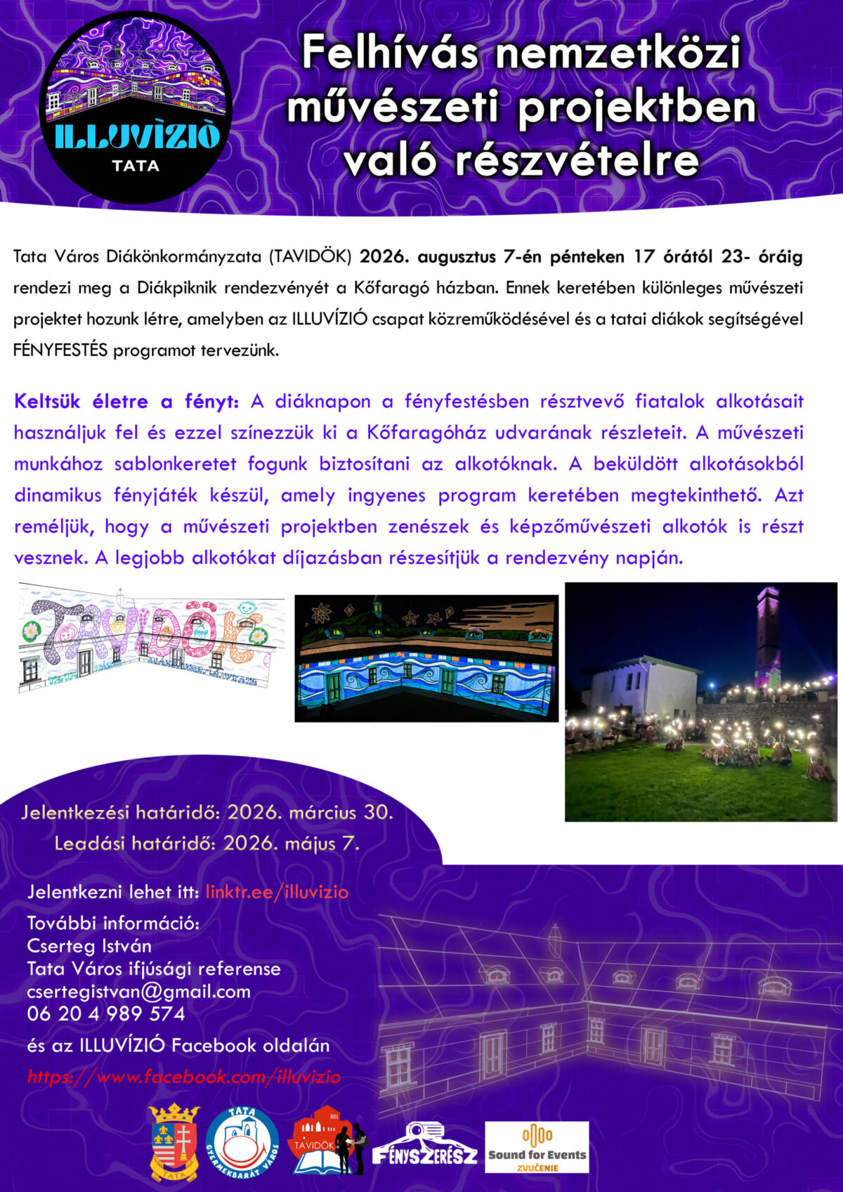 Tata Város Diákönkormányzata (TAVIDÖK) 2026. augusztus 7-én pénteken rendezi meg az idei Diákpikniket a Kőfaragó házban. Az esemény programjában egy különleges művészeti projekt is szerepel, amelyben az „Illuvízió” csapat közreműködésével és tatai diákok segítségével fényfestést terveznek: a résztvevő fiatalok alkotásait felhasználva fogják kiszínezni a Kőfaragó-ház udvarát. A művészeti munkához sablonkeretet biztosítanak majd az alkotóknak, akiknek műveiből dinamikus fényjáték készül.