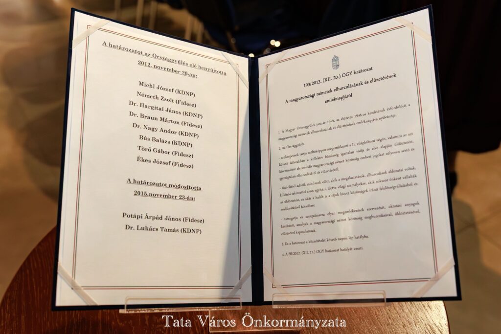 A tatai megemlékezésen Dr. Schmidtmayer Richárd múzeumigazgató mondott köszöntőt, majd az eseményt Bachmann Katalin, a Német Nemzetiségi Múzeum közönségkapcsolati munkatársa nyitotta meg: – Azt kívánom magunknak, hogy fogjunk össze, hogy ne egymás hibáit keressük, és ne a hiányosságokat egymás munkájában, hanem támogassuk egymást, különösen a fiatalságot, az új generációt, teret adva nekik ahhoz, hogy megtalálják a saját útjukat, melyen keresztül átvezetnek minket a következő évtizedbe. „Nem tudunk visszamenni a múltba, nem tudjuk megváltoztatni azt, de el tudunk indulni innen, ahol most vagyunk, és közösen alakíthatjuk a jövőt”- zárta gondolatait egy idézettel Bachmann Katalin.