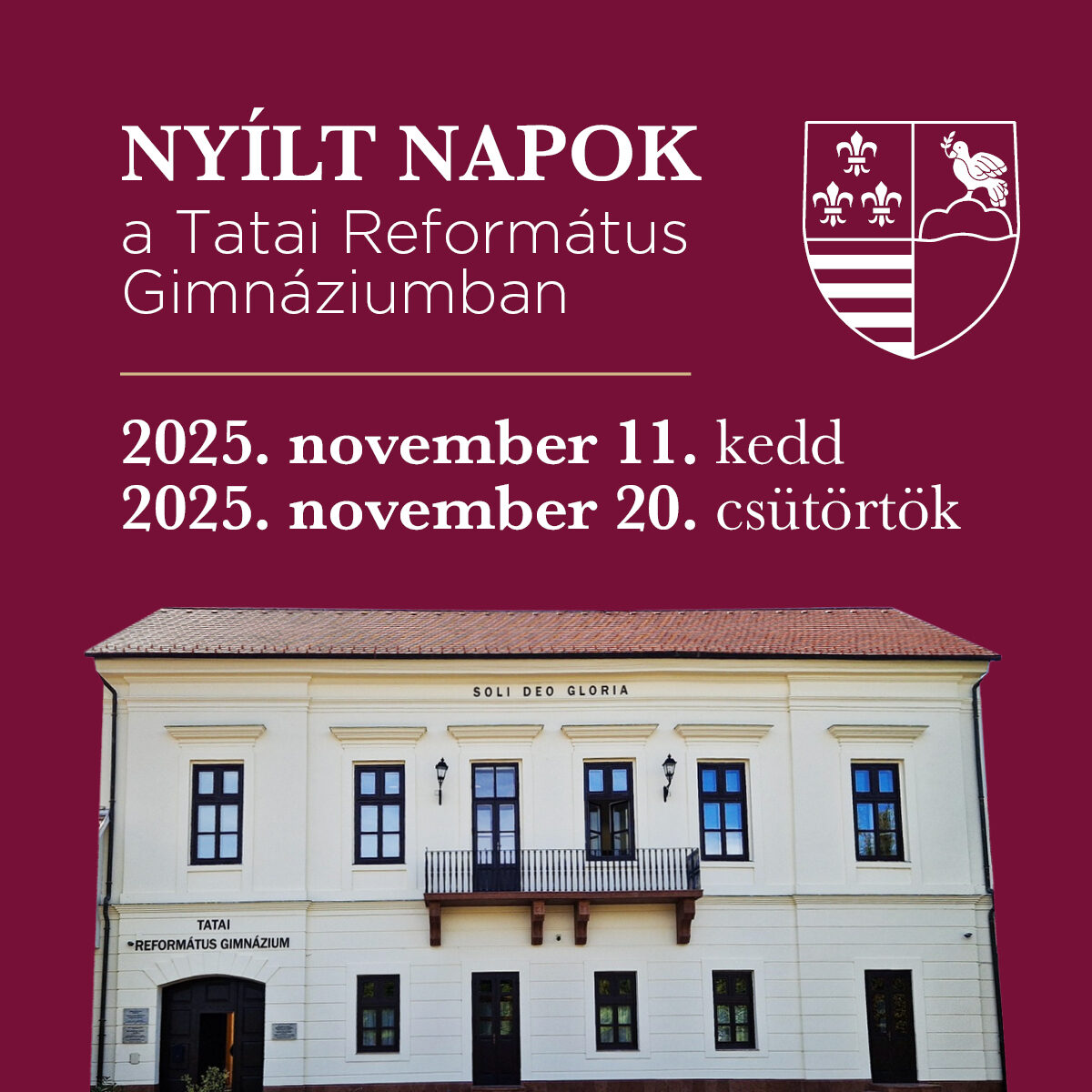 Nyílt napokat szervez november 11-én és 20-án a Tatai Református Gimnázium, ahol ezen a két napon „nyitott ajtók” mellett tanítanak, vagyis az érdeklődő szülők és diákok bármelyik tanórára bemehetnek, akár tíz percre is. A nyílt napra érkezőket egy kifejezetten erre az alkalomra fejlesztett online felület is segíti majd.
