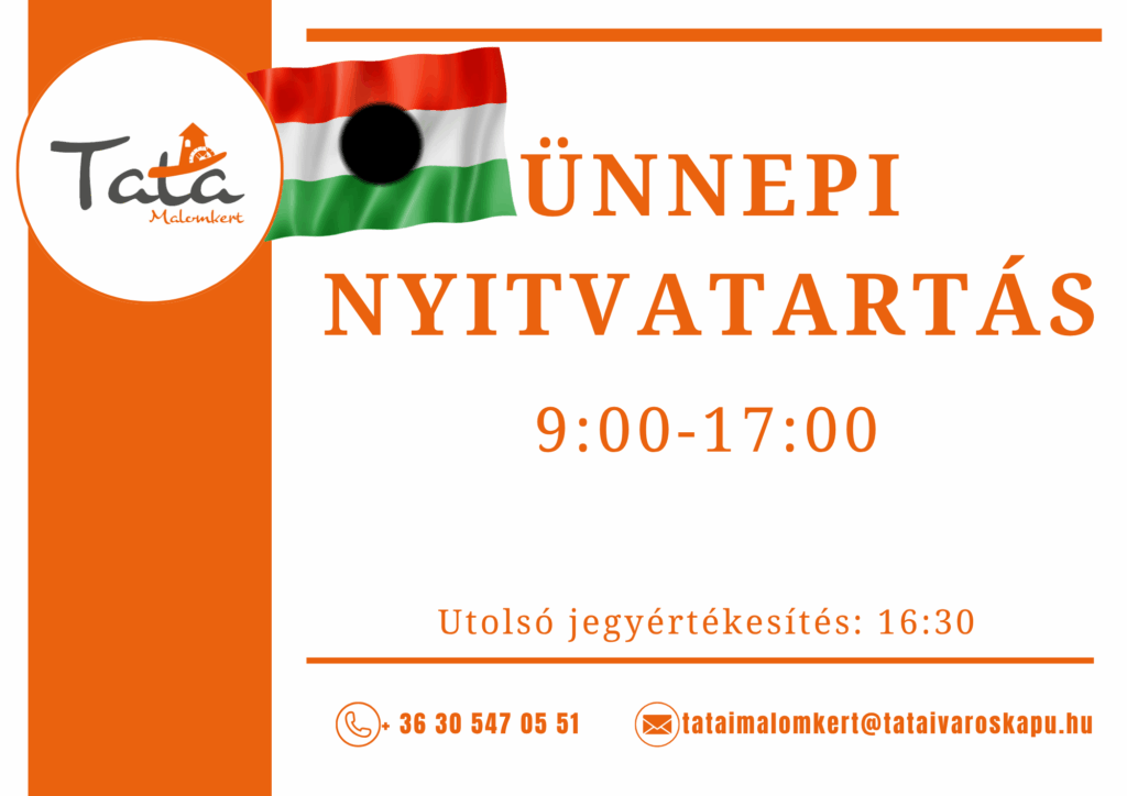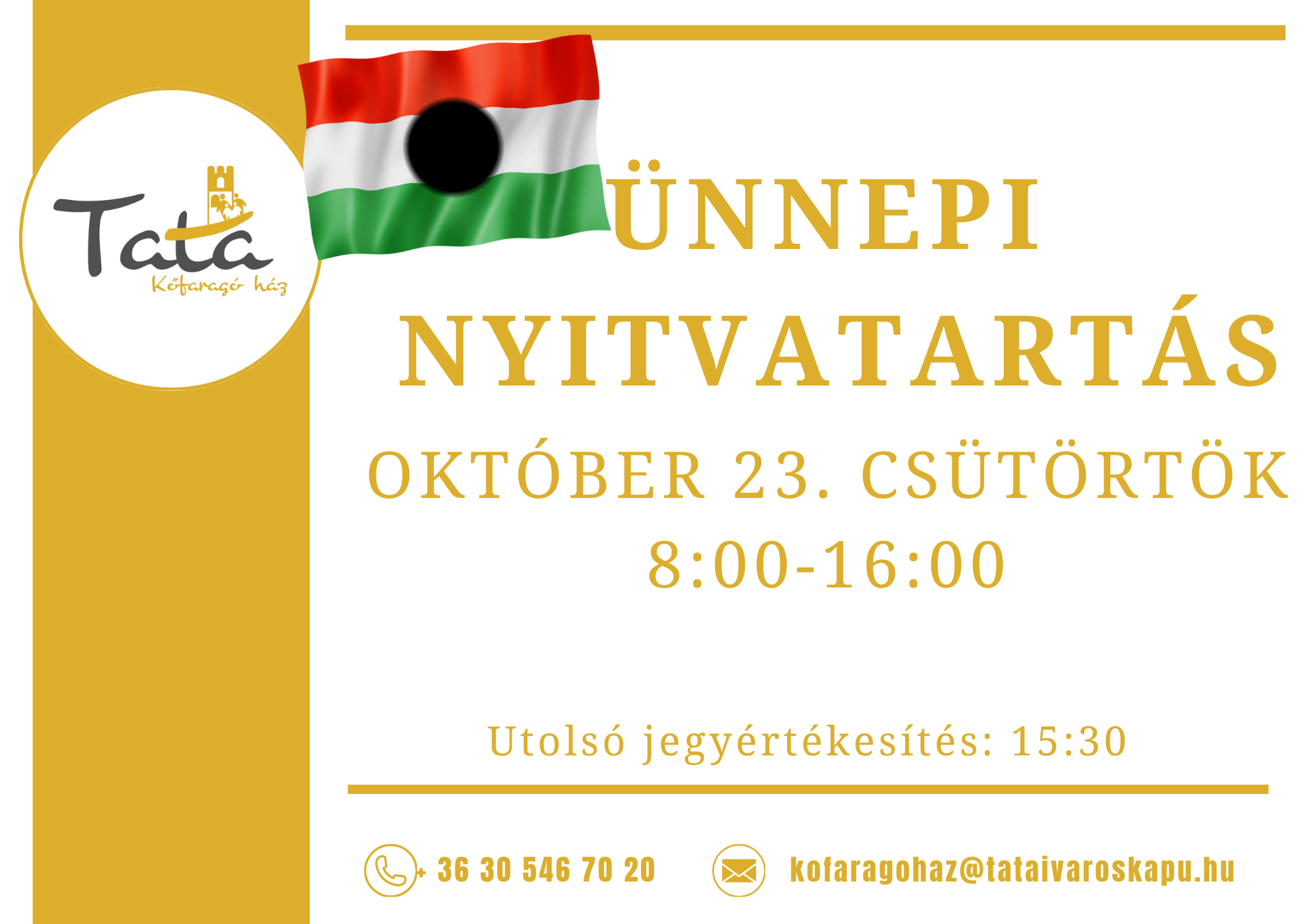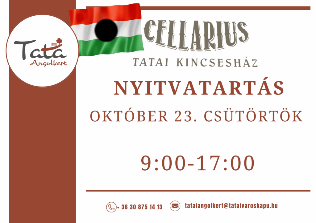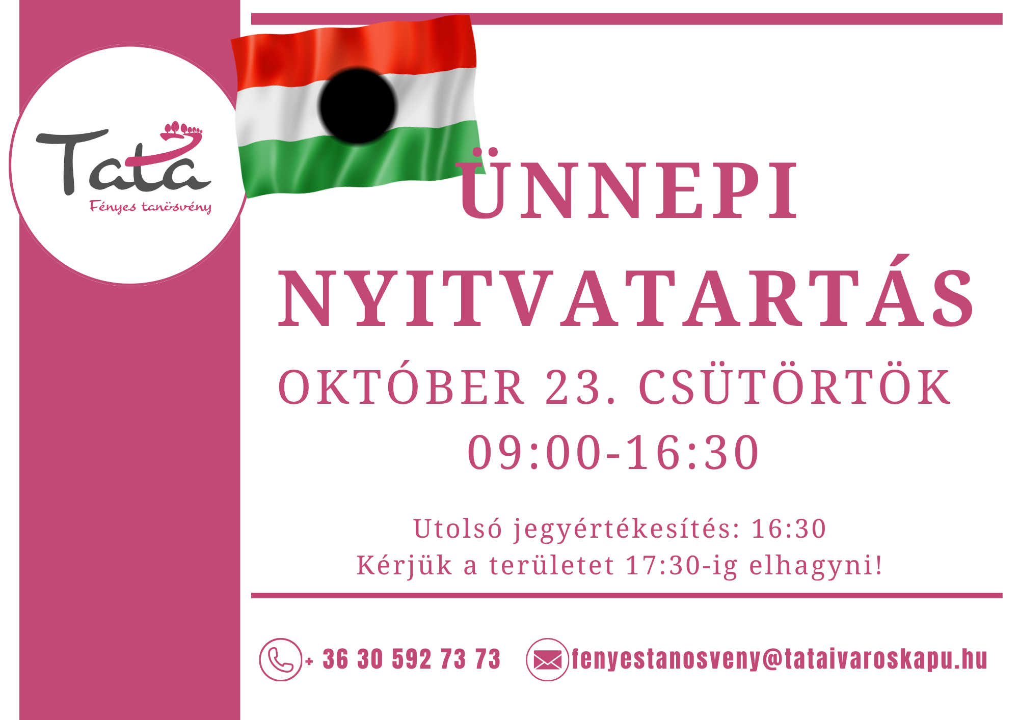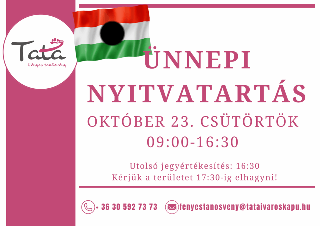 A Tatai Városkapu Nonprofit Zrt. tájékoztatása szerint a Tatai Fényes Tanösvény, a Kőfaragó-ház, a Malomkert, valamint a Kiskastély és a Cellarius nyitvatartási rendje október 23. és 26. között a következőképpen alakul: