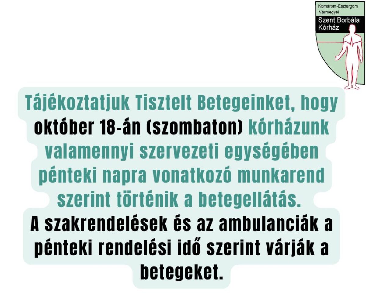 A tatabányai Szent Borbála Kórház tájékoztatása szerint október 18-án szombaton, az intézmény valamennyi szervezeti egységében pénteki napra vonatkozó munkarend szerint történik a betegellátás. A szakrendelések és az ambulanciák a pénteki rendelési idő szerint várják majd a betegeket.