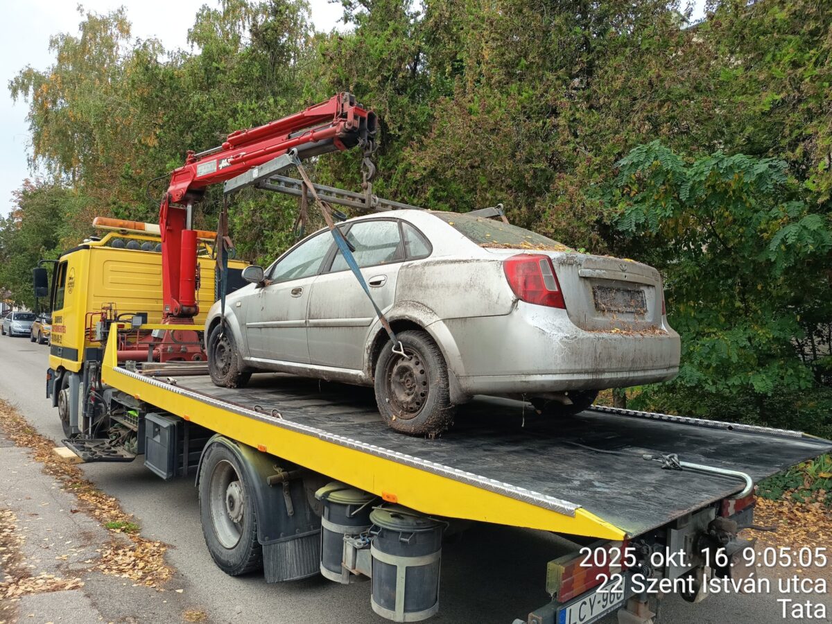 A Tatai Közös Önkormányzati Hivatal közterület-felügyelője 2025. október 16-án a Tata, Gesztenye fasor 33. szám alatti ingatlan előtti, hatósági jelzés nélkül tárolt, Daewoo típusú gépkocsit elszállíttatta. A személygépkocsi kiadására a közterület-felügyelet jogosult.
