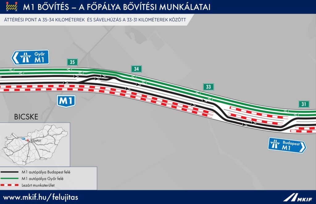 -a Győr irányába tartó két forgalmi sáv pedig változtatás nélkül, marad az eddigi rend szerint a Győr felé tartó pályaoldalon (zöld jelzés).