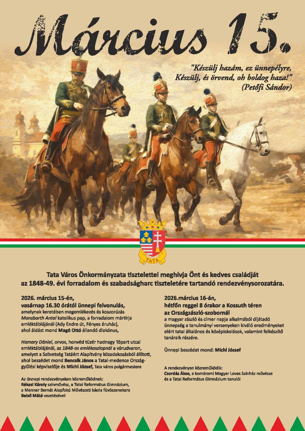 Tata Város Önkormányzata tisztelettel hívja és várja a tataiakat az 1848-49. évi forradalom és szabadságharc tiszteletére szervezett rendezvénysorozatára: