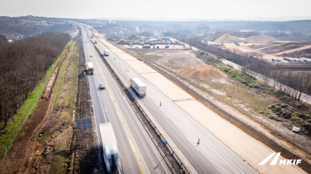 A pálya mellet egyre több helyen tűnnek fel a már szélesebb töltéstestek, melyek a következő időszakban ideiglenes burkolatot kapnak – tájékoztat az MKIF Magyar Koncessziós Infrastruktúra Fejlesztő Zrt. az M1-es autópálya bővítési munkálataival kapcsolatban. Mint írják, várhatóan 2026 őszén erre a már ideiglenesen szélesített, Budapest felé tartó pályaoldalra kerül át az irányonkénti 2×2 sávos forgalom, és megkezdődhet a Győr felé vezető oldal teljes visszabontása 100-120 cm mélységben.